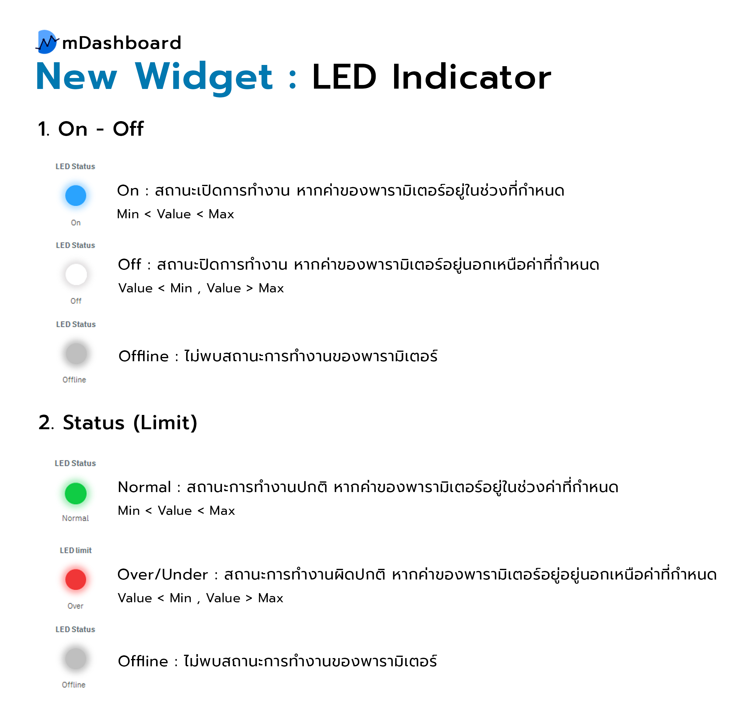 - LED Indicator : ไฟแสดงสถานะ เปิด,ปิด ออฟไลน์ และการทำงานที่ปกติ, ผิดปกติ