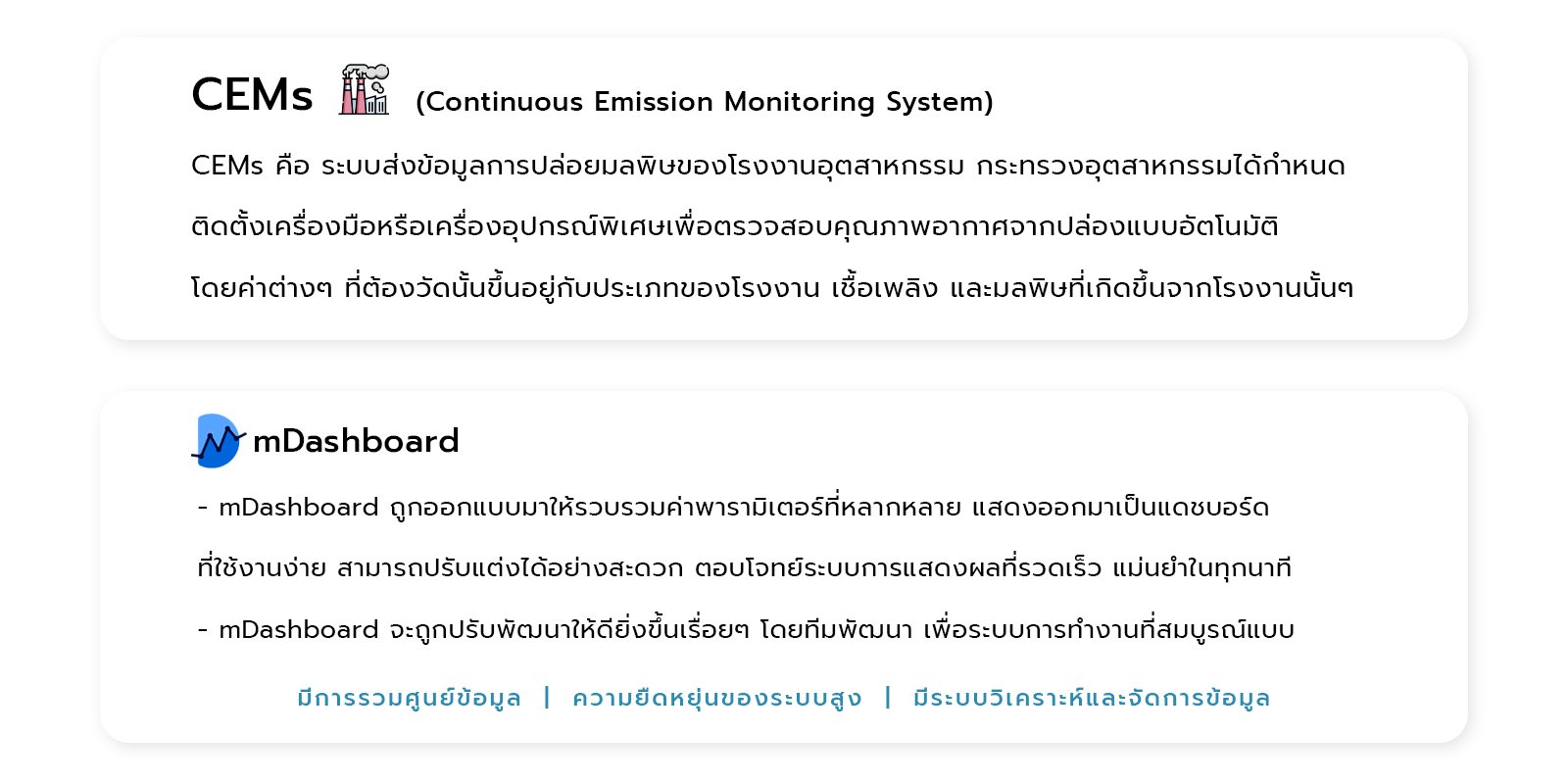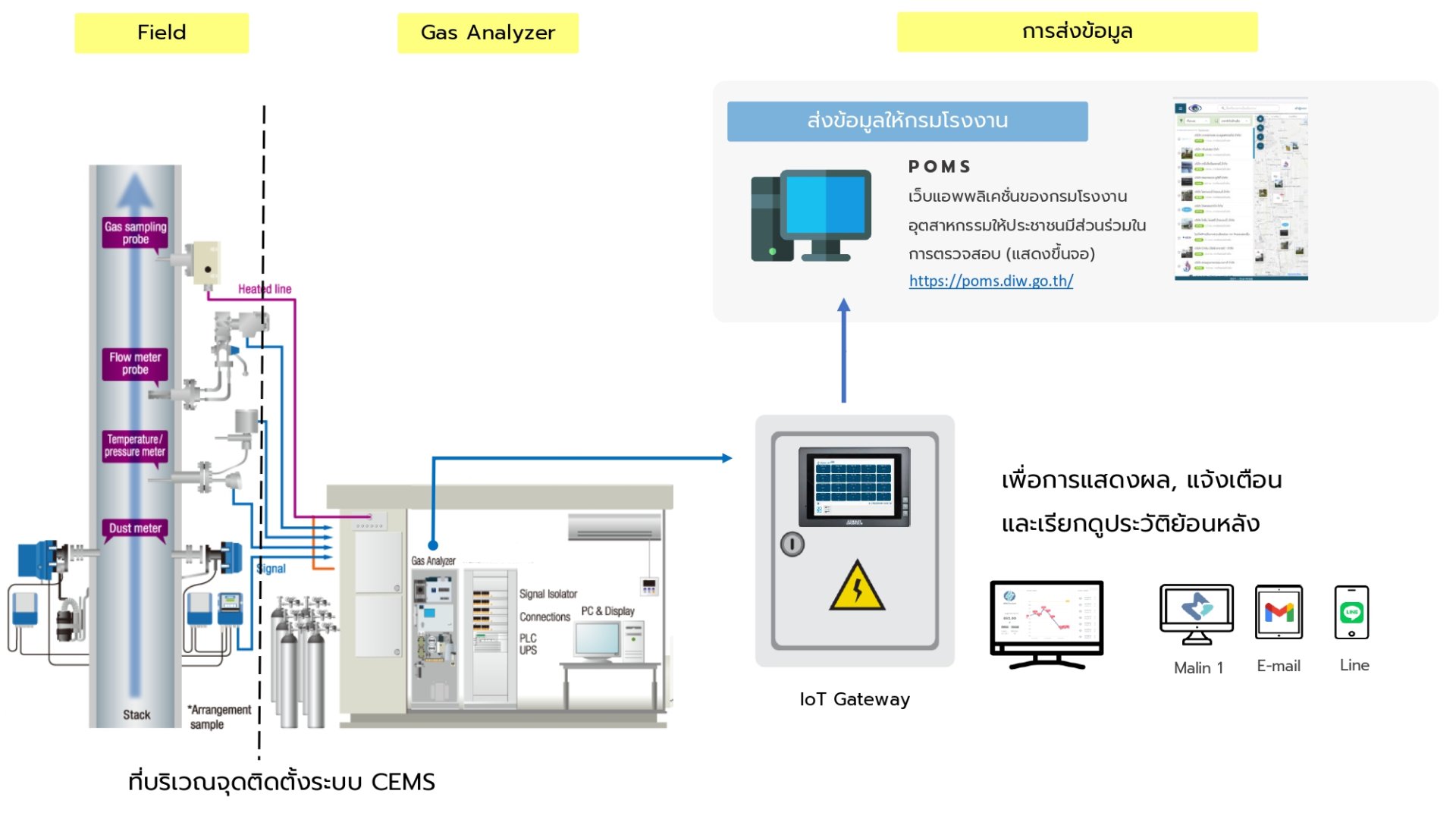 อัตโนมัติอย่างต่อเนื่อง (Continuous Emission Monitoring Systems: CEMS) พ.ศ. 2550 กำหนดให้การประกอบกิจการบางประเภท ต้องดำเนินการติดตั้งเครื่องมือหรือเครื่องอุปกรณ์พิเศษฯ สำหรับตรวจสอบคุณภาพอากาศจากปล่องแบบอัตโนมัติ